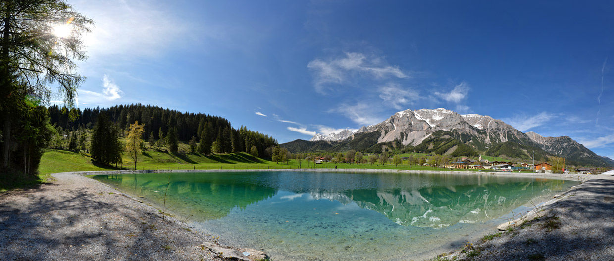 Der Panoramaweg bietet auf diesem Abschnitt eine schöne Übersicht über Ramsau-Kulm. Da der Panoramaweg am Süd-Abhang des Dachsteinmassives entlang führt, ist er besonders sonnig. Vom Alpenhof führt der Weg nun beim Haus Maria links vorbei und dann bergab durch den Wald (Markierung Rot). Mit einer Linksabzweigung wandert man zu einem kleinen Brückerl und weiter bis auf die Straße, die zum Kalcher führt. Rechts abbiegen bis zur Straße nach Rössing. Dieser folgt man nun in Richtung Lodenwalke (links) bis zum Haus Steinacker, ca. 300 Meter, wo die Querverbindung zum Hofrat-Gruber-Weg abzweigt (geschottert) - rechts. Am Hofrat-Gruber-Weg angelangt, rechts wenden (denn links geht es weiter zum Percht und Lodenwalker). Dieser Weg führt nun an der N-Seite des Sattelberges, entlang des Ramsau-Baches nach Ramsau-Kulm (Freischwimmbad). Reine Gehzeit: 4 1/2 bis 5 Stunden.