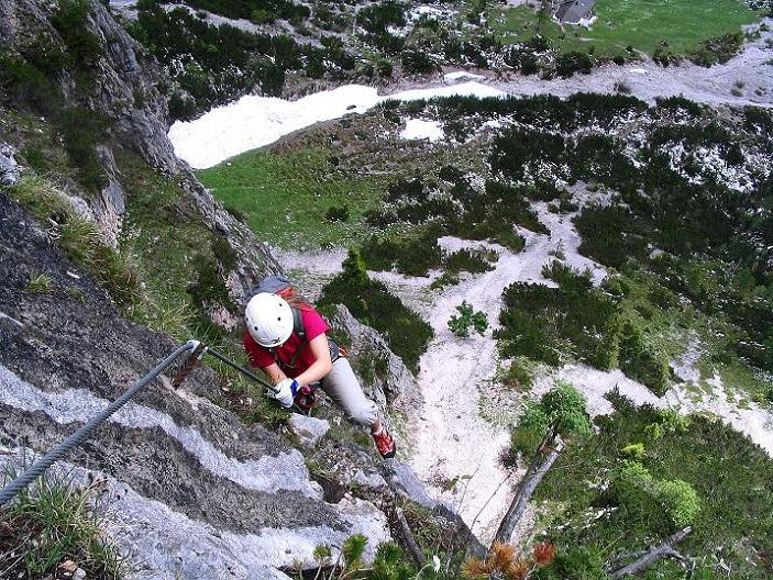 Abstieg: Vom Ausstieg den Steigspuren (rot markiert, max. A) zu Weg 619 folgen und über diesen zurück zur Silberkarhütte. Die Klamm hinunter zum Parkplatz Silberkarklamm